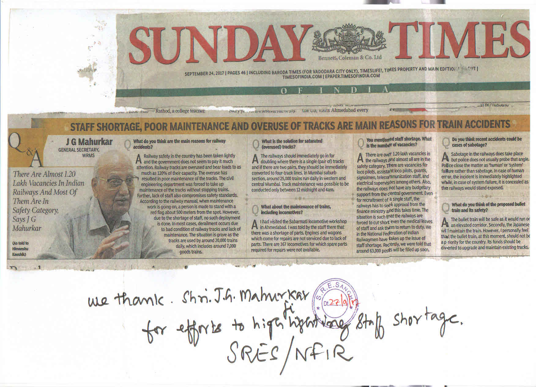 Thanks to Shri.J.G.Mahurkar, GS/WRMS for his efforts to highlight Staff Shortage | Preview |